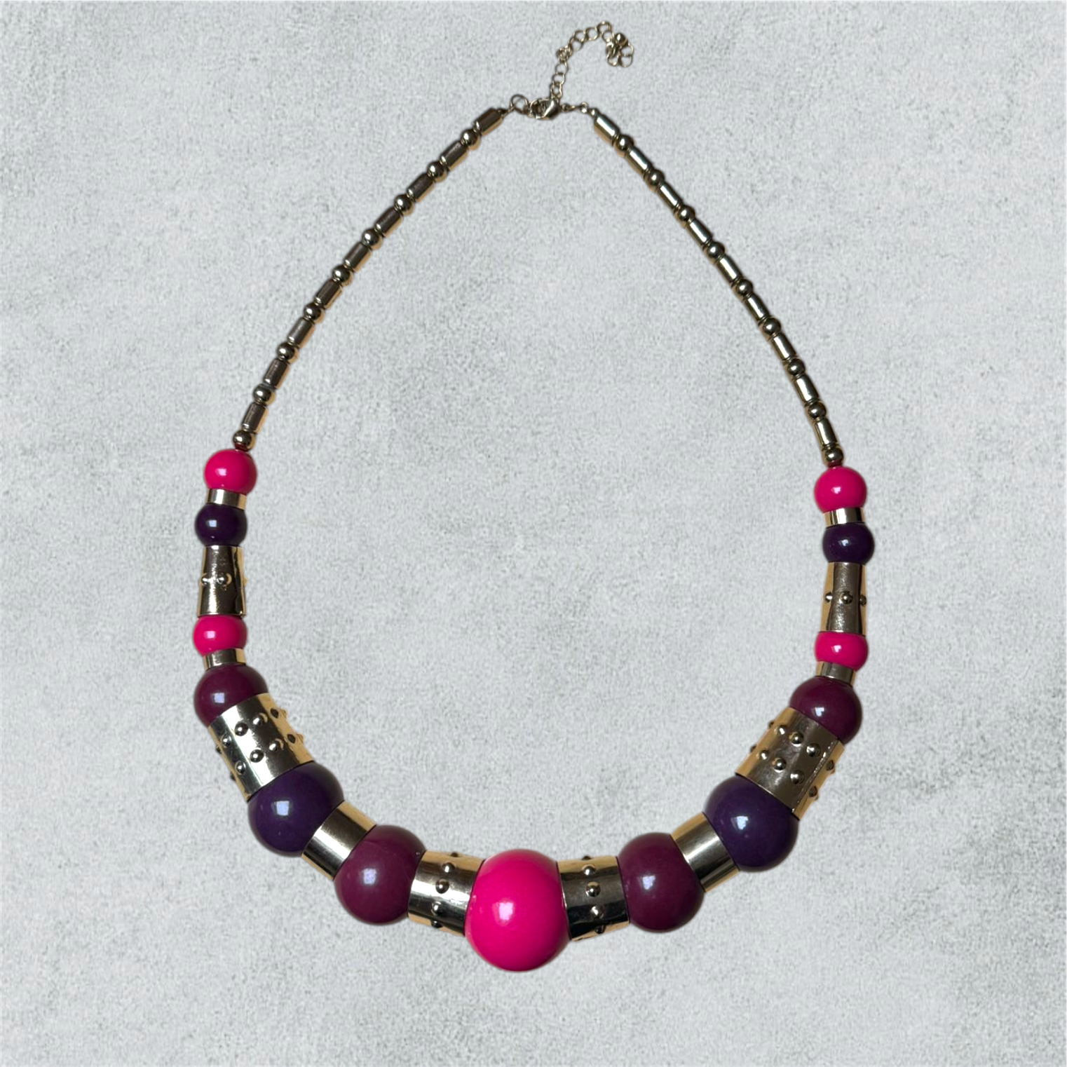 Bold boho necklace combining magenta, burgundy, and gold-tone beads. A striking color mix with metallic elements for a sophisticated statement look.