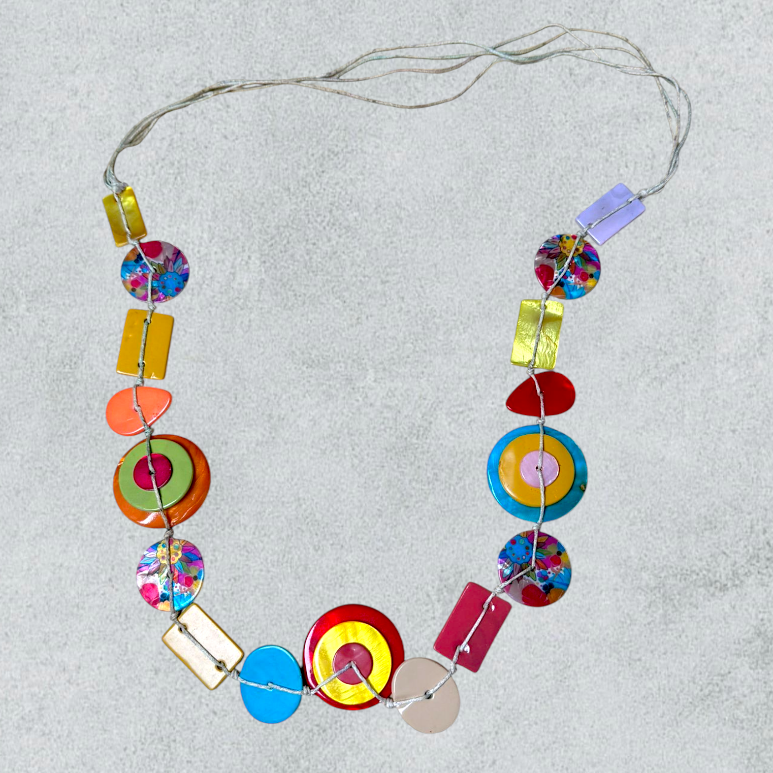 A burst of color and creativity! This statement necklace features vibrant geometric resin pieces with artistic patterns. Perfect for those who love bold, playful accessories that bring joy and individuality to any look.