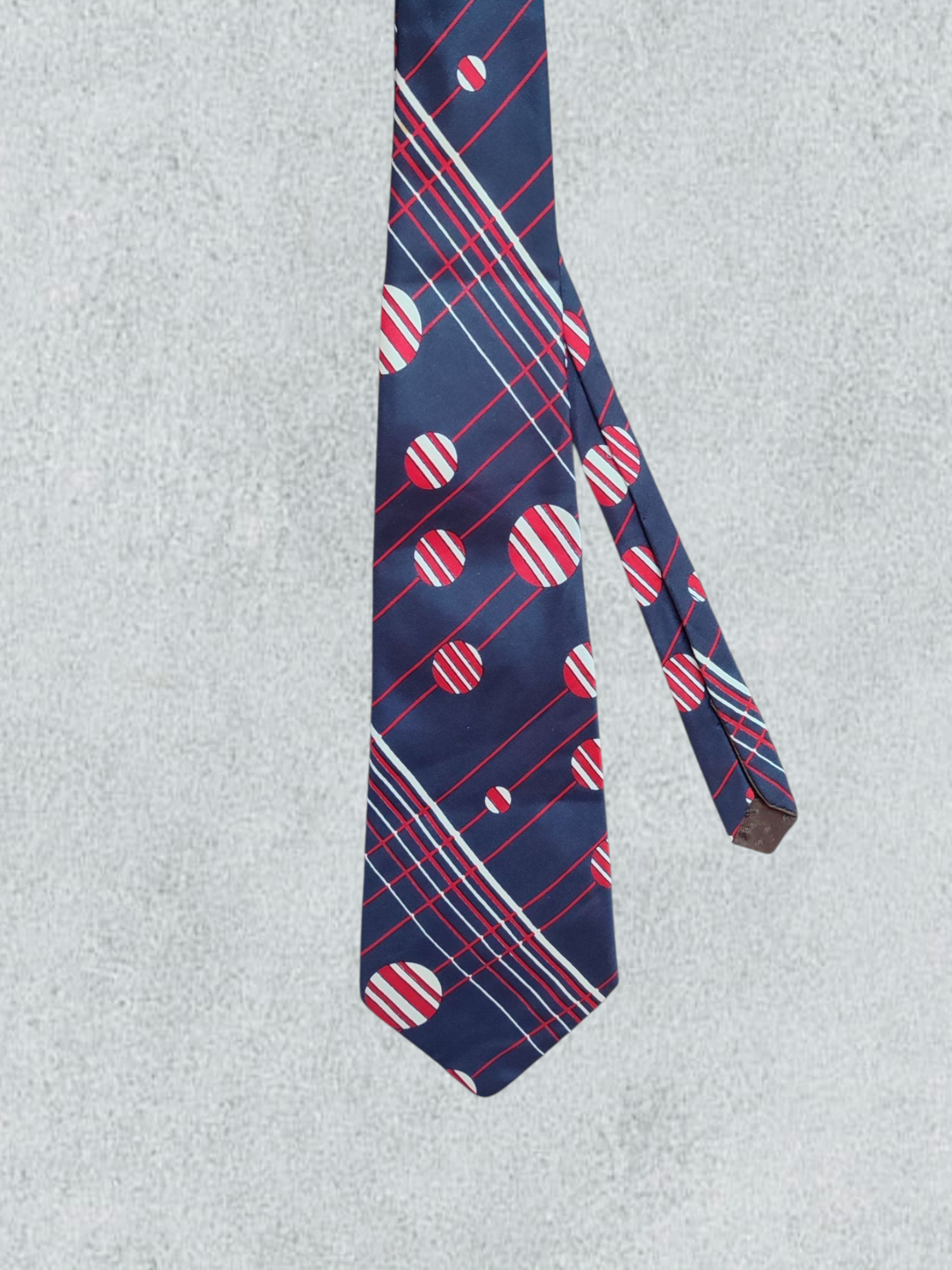 • Pattern: Tie with a distinctive polka dot and cross-stripe design. The model suggests a style that could date back to the 1980s.
